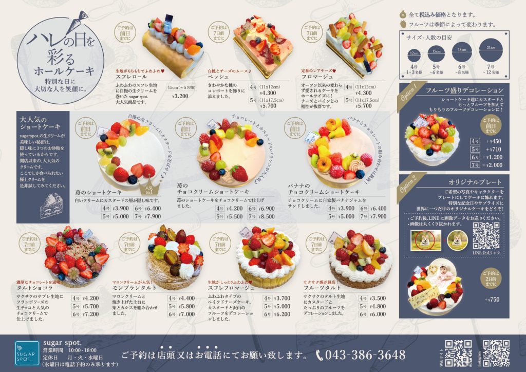 ご予約情報 ORDER INFORMATION 事前にご連絡頂き、特別な日を彩るケーキを簡単にご予約! バースデーケーキや世界に一つだけのオリジナルデザインケーキなど、 大切な瞬間を華やかに演出するお手伝いをいたします。 ホールケーキメニュー WHOLE CAKE MENU ※店頭でお配りしているメニュー表です。(こちらからダウンロードできます。) ホールケーキのご予約 HOW TO ORDER WHOLE CAKES ※ご予約は、店頭又はお電話で承ります。 店 頭 地図 〒263-0051 千葉市稲毛区園生町122−2 お電話 043-386-3648 営業時間 10:00 - 18:00 定休日 月・火・水曜日 ※水曜日は電話予約のみ承ります。 ケーキのサイズ SIZE OF CAKES オプション OPTIONS もりもりのフルーツデコレーション ショートケーキ達にカスタードともっとフルーツを加えてもりもりのフルーツデコレーションに! ご予約は前日までにお願いします。 ケーキサイズ追加料金4号+¥4505号+¥7106号+¥1,2007号+¥2,000 オリジナルプレート ご希望の写真やキャラクターをプレートにしてケーキに飾れます。 特別な記念日やサプライズに、 世界に一つだけのオリジナルケーキをどうぞ! ご予約は2日前までにお願いします。 ケーキサイズ追加料金全て+¥750 オリジナルプレートのご予約方法 ❶ ご予約店舗又はお電話にてご予約ください。TEL: 043-386-3648住所:〒263-0051 千葉県千葉市稲毛区園生町122−2 ❷ 写真の準備写真ご提出の際のお願いバースデーケーキ用に、お客様からいただいた写真を 円形に切り抜いて使用 いたします。そのため、写真をお選びいただく際には以下の点にご注意ください。肝心な被写体(顔や中心にしたい部分)が円形の中に収まる構図 をお選びください。被写体が端に寄りすぎている場合、切り抜き後に見えなくなる可能性があります。被写体の周りに余裕のある写真がおすすめです。切り抜きの調整がしやすく、美しい仕上がりになります。 ❸LINEで送信sugar spot.のLINEに画像データーをお送りください。➜こちらから直接sugar spot.のLINEにアクセスする。↓sugarspot.のLINEにQRコードからアクセスする